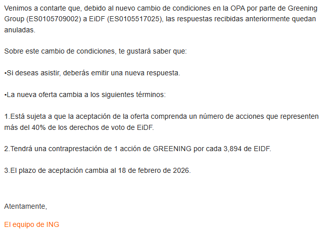 Te informamos de que ha sido autorizada la OPA de GREENING GROUP. sobre EIDF, y se ha abierto el plazo para acudir a la misma.